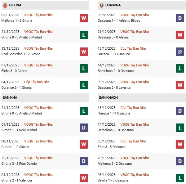 - Trên sân nhà, Girona thắng 4, thua 1 trước Osasuna.