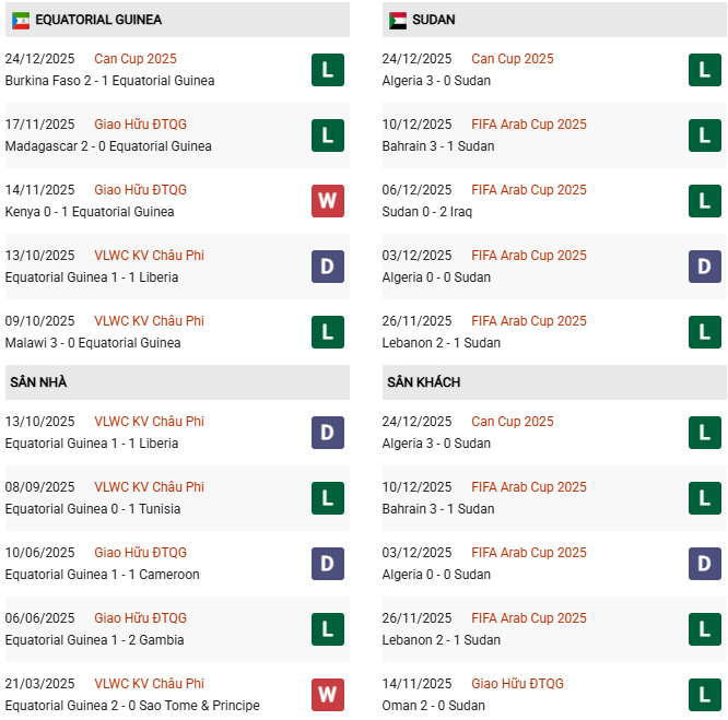 - Guinea Xích Đạo toàn thắng cả 2 trận đối đầu Sudan gần đây.