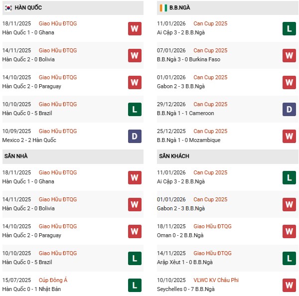 Thống kê phong độ Hàn Quốc vs Bờ Biển Ngà: