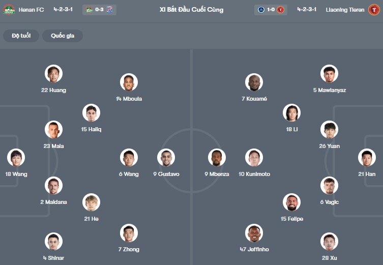 Đội hình dự kiến Henan Songshan vs Liaoning Tieren: