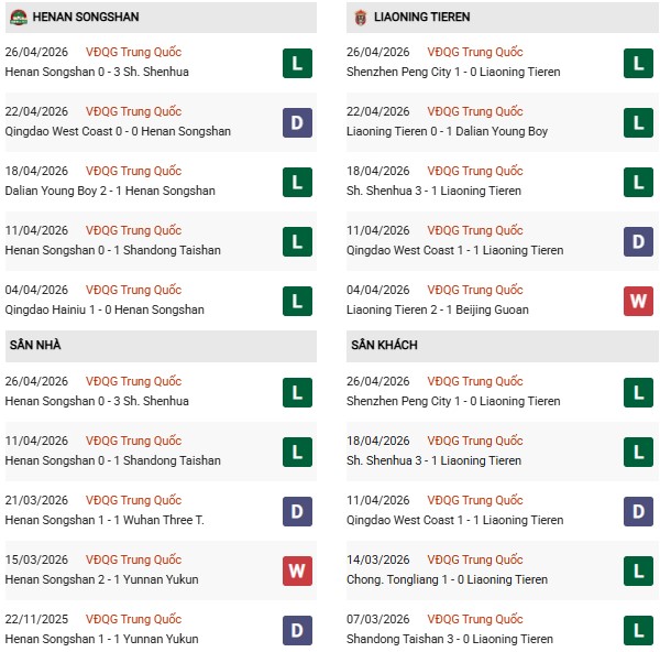 Thành tích đối đầu Henan Songshan vs Liaoning Tieren: