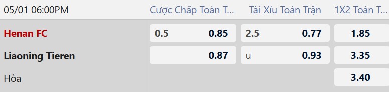 Thông tin tỷ lệ Henan Songshan vs Liaoning Tieren: