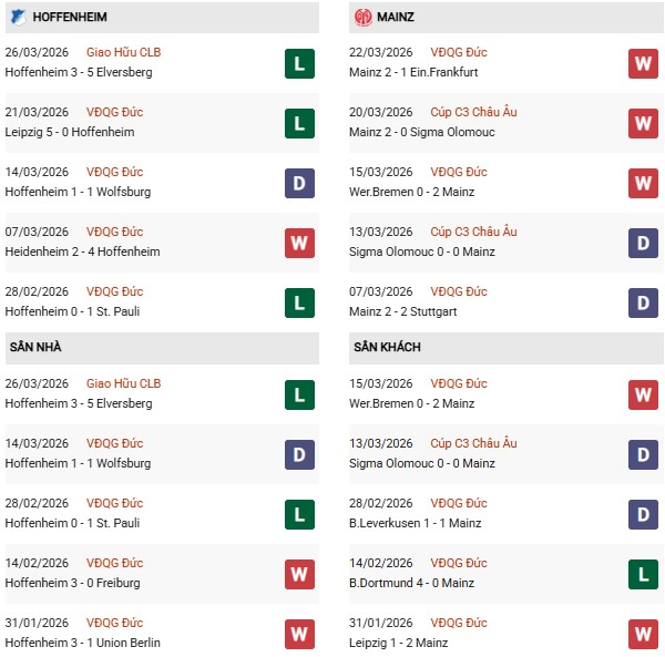 Thống kê phong độ Hoffenheim vs Mainz: