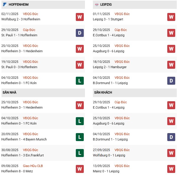 Thành tích đối đầu Hoffenheim vs RB Leipzig: