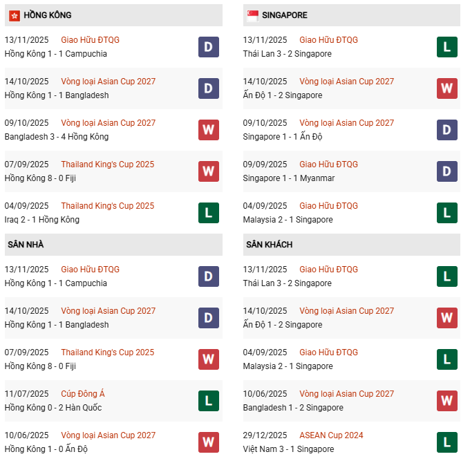 - Hong Kong thắng 4 thua 2 trong 10 trận đối đầu gần nhất trước Singapore.