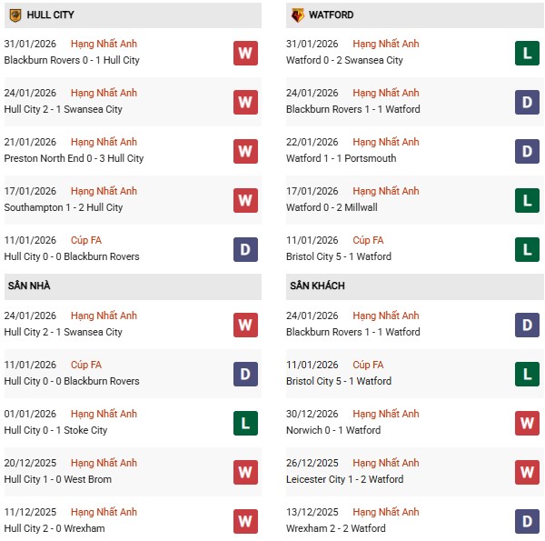 - Hull thắng 2, hòa 3, thua 5 trong 10 trận gặp Watford gần đây.
