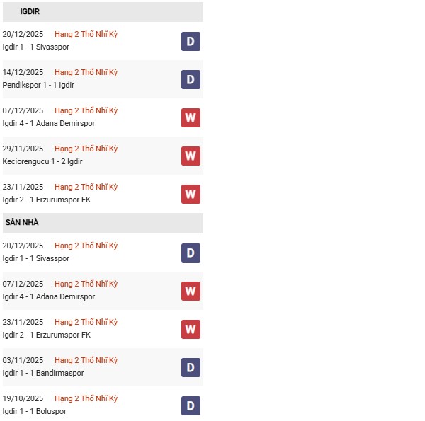 Igdir hiện đang thi đấu tại giải Hạng 2 Thổ Nhĩ Kỳ và cho thấy sự ổn định đáng kể trong thời gian gần đây. Cụ thể, đội bóng này giành được 5 chiến thắng, 3 trận hòa và chỉ thua 2 trong 10 trận gần nhất – thành tích phản ánh lối chơi khá cân bằng giữa công và thủ.