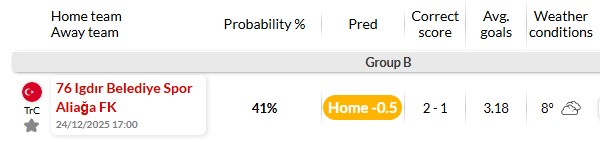 Đặc biệt, sân nhà đang là điểm tựa lớn với Igdir khi họ thắng 5, hòa 4 và chỉ thua 1 trong 10 trận gần đây. Igdir thường nhập cuộc chủ động, đẩy cao đội hình và sẵn sàng chơi tấn công trước những đối thủ bị đánh giá thấp hơn. Việc chạm trán Aliaga – đội bóng đến từ Hạng 3 là cơ hội để Igdir hướng tới 3 điểm, qua đó tạo lợi thế sớm trong cuộc đua giành vé đi tiếp ở bảng đấu.