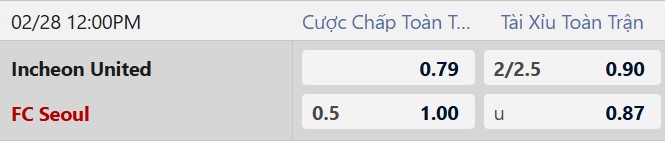 Thông tin tỷ lệ cược Incheon United vs FC Seoul:
