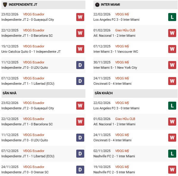 Thống kê phong độ Ind. del Valle vs Inter Miami: