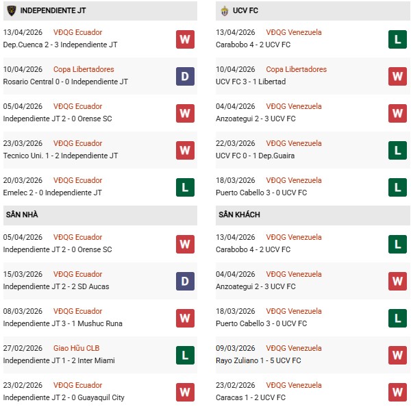 Thống kê phong độ Ind. del Valle vs UCV FC: