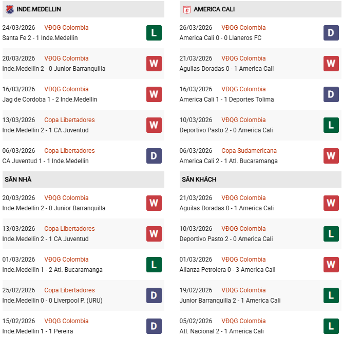 America Cali mấy năm gần đây trở thành khắc tinh thực sự với Independiente Medellin với vẻn vẹn 1 thất bại sau 8 cuộc đụng độ giữa đôi bên.