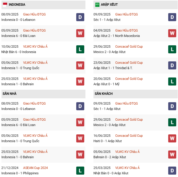 Thống kê phong độ Indonesia vs Saudi Arabia: