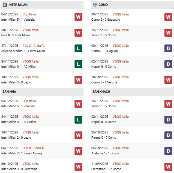 - Trên sân nhà, Inter Milan thắng cả 2 trận trước Como.