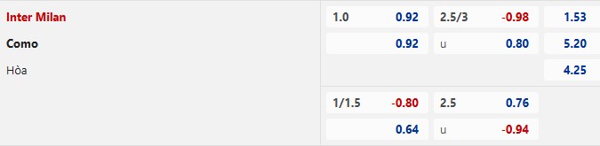 Inter Milan thắng theo châu Á: Inter thắng theo châu Á cả 5 trận sân nhà gần đây khi nhường đối phương 1 đến 2 1/4 bàn. Como thua theo châu Á 4/6 trận sân khách vừa qua khi được nhường 1/2 bàn trở lên. 4 lần chạm trán gần nhất ở Serie A, Inter 100% thắng theo châu Á và thậm chí hoàn toàn giữ sạch lưới. Inter chỉ hơn Como đúng 2 bậc và 3 điểm trên BXH nên nhường tới 1 bàn là quá sâu, báo hiệu đội cửa trên sẽ giành 3 điểm.