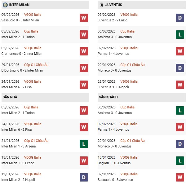Thành tích đối đầu Inter Milan vs Juventus: