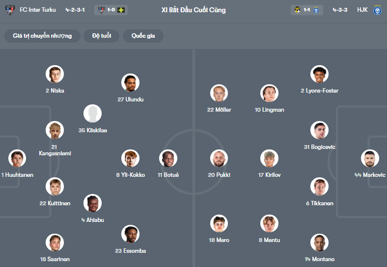 Đội hình dự kiến Inter Turku vs HJK Helsinki: