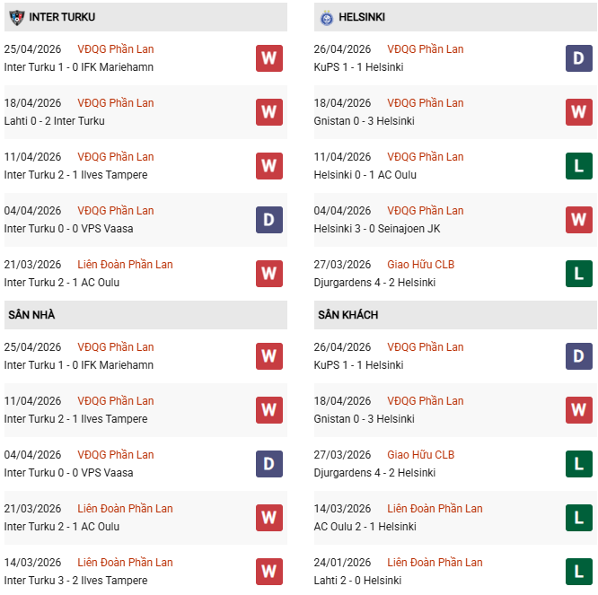 - Trên sân nhà, Inter Turku thắng 1, thua 6 trước HJK Helsinki.