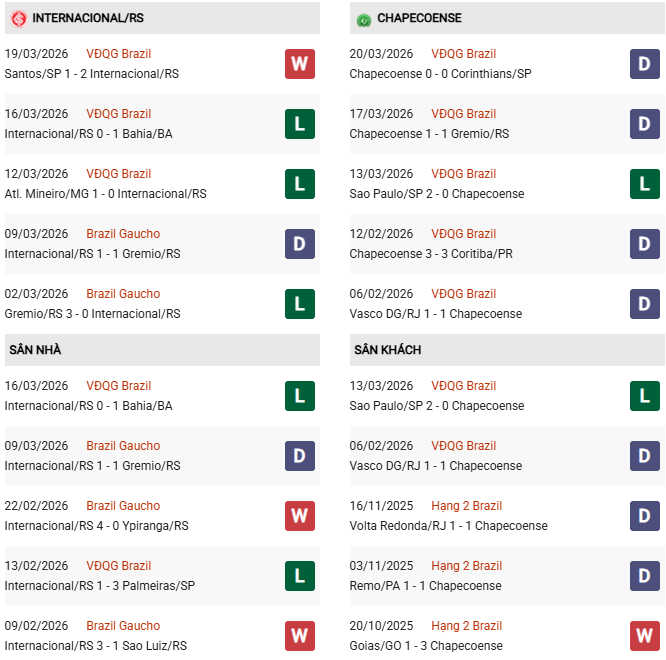 Ở phía đối diện, Chapecoense đang đứng thứ 14 với 7 điểm và phần nào cho thấy sự ổn định hơn. Họ bất bại 3/5 trận gần nhất với 2 chiến thắng và 1 trận hòa, dù vẫn xen kẽ những thất bại. Lối chơi của Chapecoense thiên về sự chắc chắn, ưu tiên phòng ngự và tận dụng cơ hội từ các tình huống phản công.
