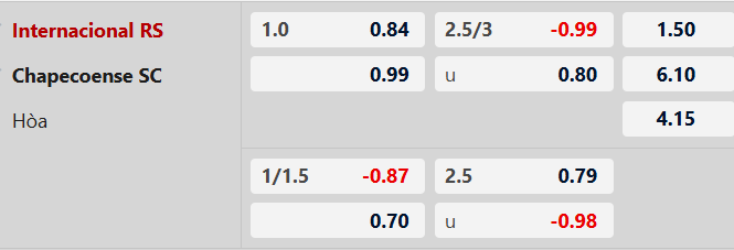 Internacional chấp 1 bàn cho thấy họ vẫn được đánh giá cao hơn nhờ lợi thế sân nhà. Tuy nhiên, với phong độ thiếu ổn định cùng khả năng tấn công không quá hiệu quả, việc thắng cách biệt là điều không dễ. Trong khi đó, Chapecoense lại có xu hướng chơi chắc chắn và không dễ bị đánh bại. Đây có thể là trận đấu mà đội khách gây nhiều khó khăn.