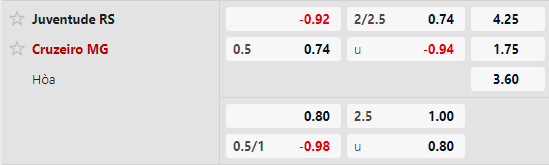 Thông tin tỷ lệ kèo Juventude vs Cruzeiro: