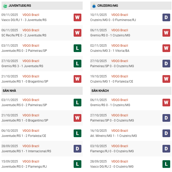 - Cruzeiro toàn thắng cả 3 trận đối đầu gần nhất trước Juventude.