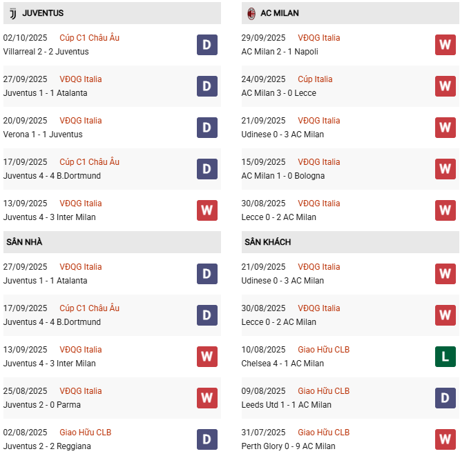 Thành tích đối đầu Juventus vs AC Milan: