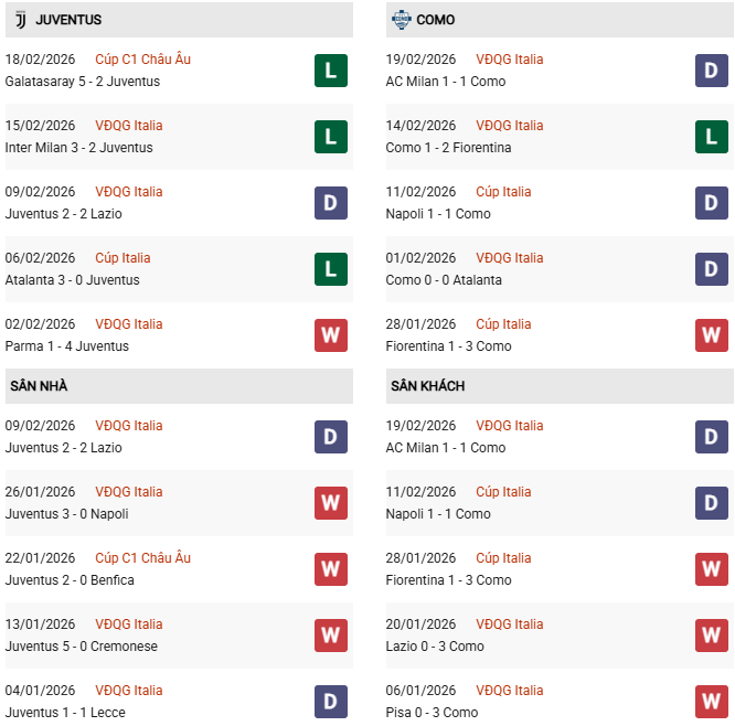 - Trên sân nhà, Juventus thắng 1, hòa 1 trước Como.