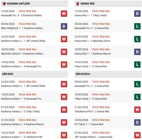 Thống kê phong độ Kashima Antlers vs Urawa Reds: