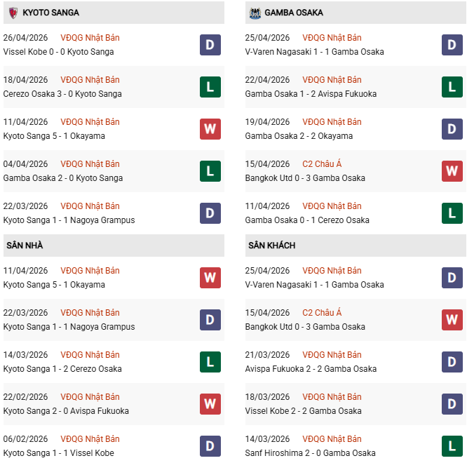 Thống kê phong độ Kyoto Sanga vs Gamba Osaka: