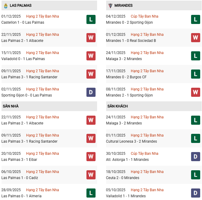 - Las Palmas thắng 3, hòa 2, thua 5 trong 10 trận gặp Mirandes gần đây.