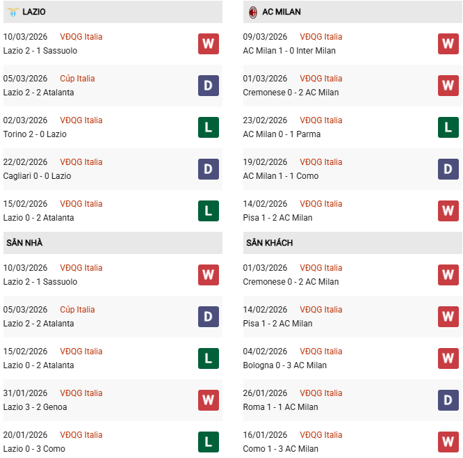 Thống kê phong độ Lazio vs Milan: