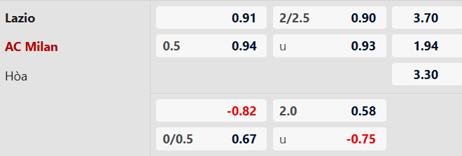 Thông tin tỷ lệ kèo bóng đá Lazio vs Milan: