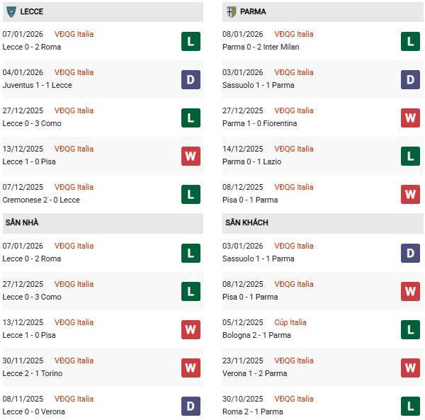 - Trên sân nhà, Lecce thắng 1, thua 5 trước Parma.