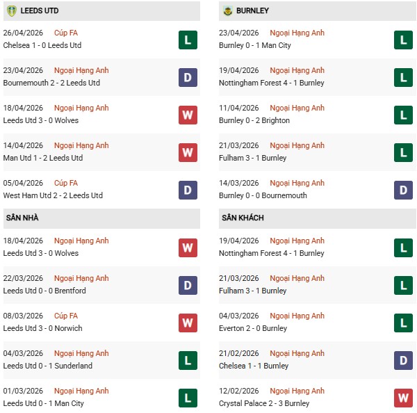 Thống kê phong độ Leeds United vs Burnley: