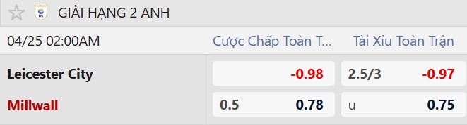 Thông tin tỷ lệ kèo Leicester City vs Millwall: