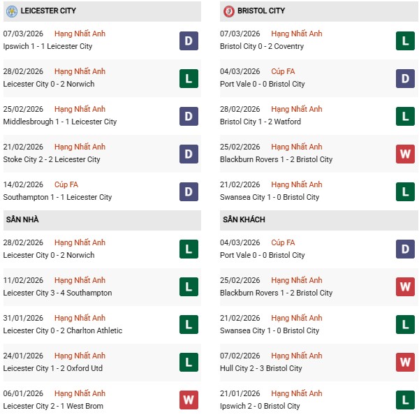 - Leicester thắng 4, hòa 2, thua 4 trong 10 trận gặp Bristol City gần đây.