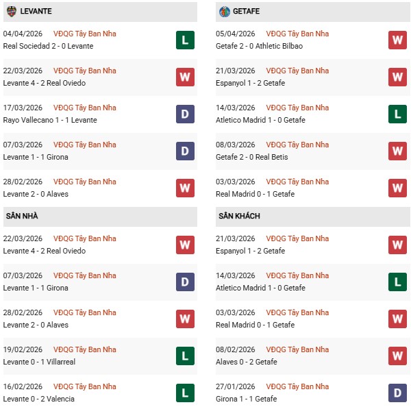 Thống kê phong độ Levante vs Getafe: