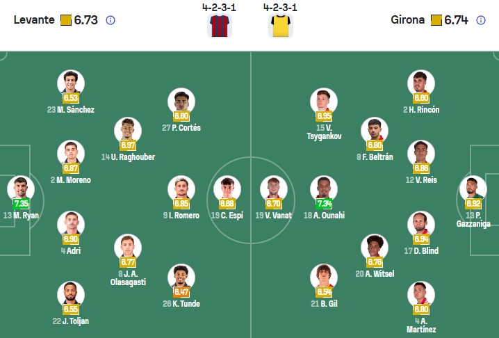 Tình hình của Girona cũng không khả quan hơn là bao. Ngoại trừ trận thắng bất ngờ trước Barcelona, đội bóng xứ Catalan đã thua 2 và hòa 2 trong tổng số 5 trận gần nhất. Trong thời gian đó, đoàn quân của huấn luyện viên Michel nhận 7 bàn thua và 6/7 bàn này xuất hiện trong hiệp hai, thời điểm Girona lộ rõ sự xuống sức và nhiều lần khiến họ đánh rơi điểm số đầy đáng tiếc. Thông số phòng ngự của Girona cũng tệ ngang ngửa Levante với 42 bàn thua từ đầu mùa.