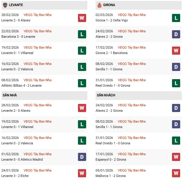 - Trên sân nhà, Levante thắng 2, thua 1 trước Girona.