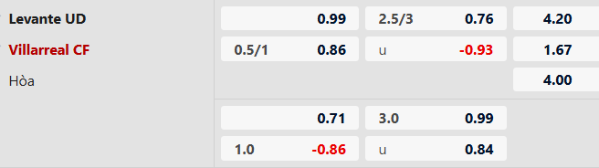 Thông tin tỷ lệ kèo Levante vs Villarreal: