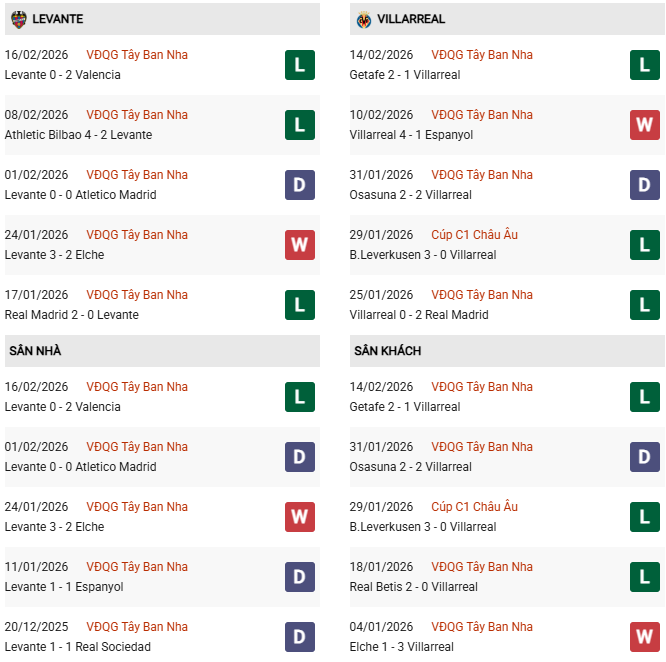 Ở trận đấu gần nhất của mình tại La Liga 2025/26, Levante và Villarreal đều thua. Trong khi Levante thua 0-2 trước Valencia thì Villarreal bại trận 1-2 khi hành quân tới sân của Getafe.
