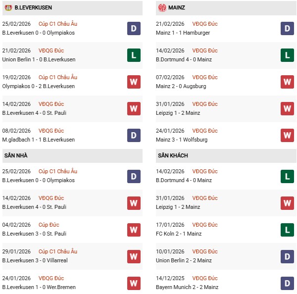 Thống kê phong độ Leverkusen vs Mainz: