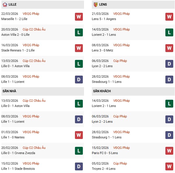 Thống kê phong độ Lille vs Lens: