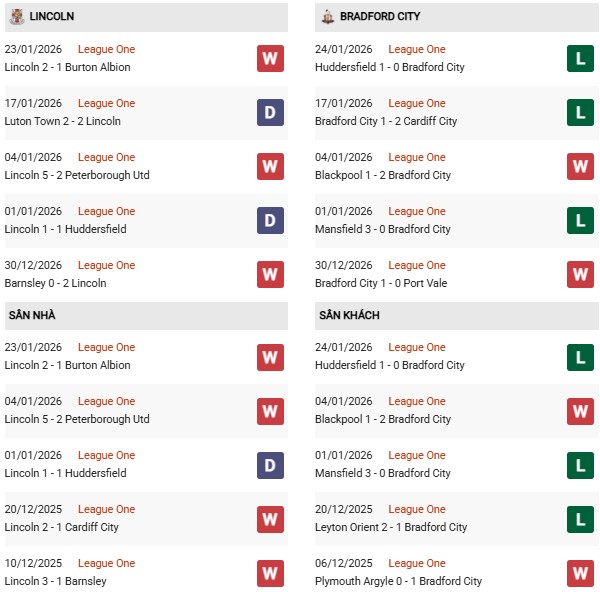 - Trên sân nhà, Lincoln thắng 1, thua 2 trước Bradford City.