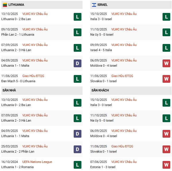 Israel dù cũng không có phong độ quá ấn tượng, nhưng họ vẫn cho thấy sự vượt trội về chất lượng đội hình và kinh nghiệm thi đấu quốc tế. Trong 10 trận gần nhất, Israel giành được 5 chiến thắng và ghi bàn trong hầu hết các trận. Dù gặp các đối thủ mạnh như Ý hay Na Uy, họ vẫn tạo ra thế trận khá tốt, đặc biệt là ở khả năng pressing tầm cao và những pha phối hợp nhóm nhanh ở tuyến giữa. Đội bóng này cũng sở hữu nhiều cầu thủ đang thi đấu tại châu Âu, giúp họ duy trì nền tảng thể lực và chiến thuật ổn định hơn so với Lithuania.