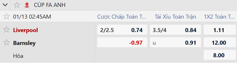 Thông tin tỷ lệ kèo Liverpool vs Barnsley: