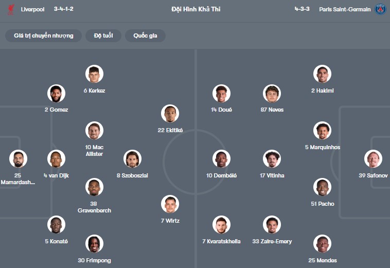 Số liệu thống kê về Liverpool gặp PSG: