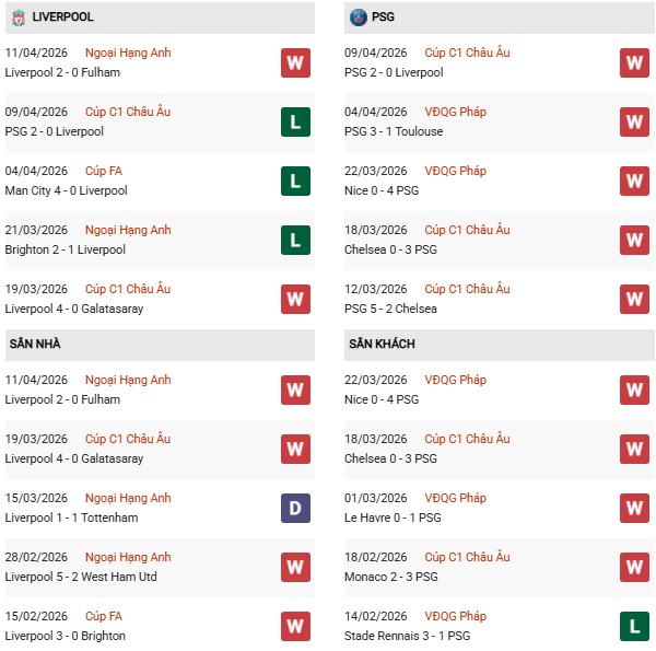 Thống kê phong độ Liverpool vs PSG: