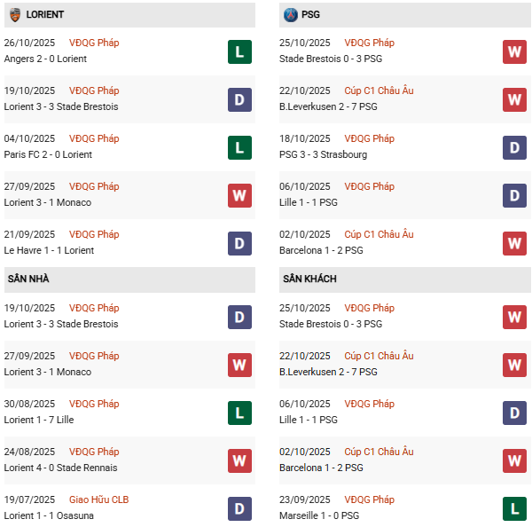 Chỉ Marseille (16) và Monaco (14) có số bàn thắng trên sân nhà nhiều hơn Lorient (11) tại Ligue 1 mùa này, nhưng việc phải nhận tới 11 bàn thua cũng khiến họ trở thành đội để thủng lưới nhiều nhất trên sân nhà tại giải đấu sau 9 vòng đấu đầu tiên. Đội chủ nhà đã từng gây bất ngờ khi đánh bại PSG tại Parc des Princes vào năm 2023, nhưng chuyến làm khách gần nhất của PSG tới Stade du Moustoir vào tháng 4 năm 2024 đã kết thúc với tỷ số 4-1, trận đấu mà Ousmane Dembele lập cú đúp.